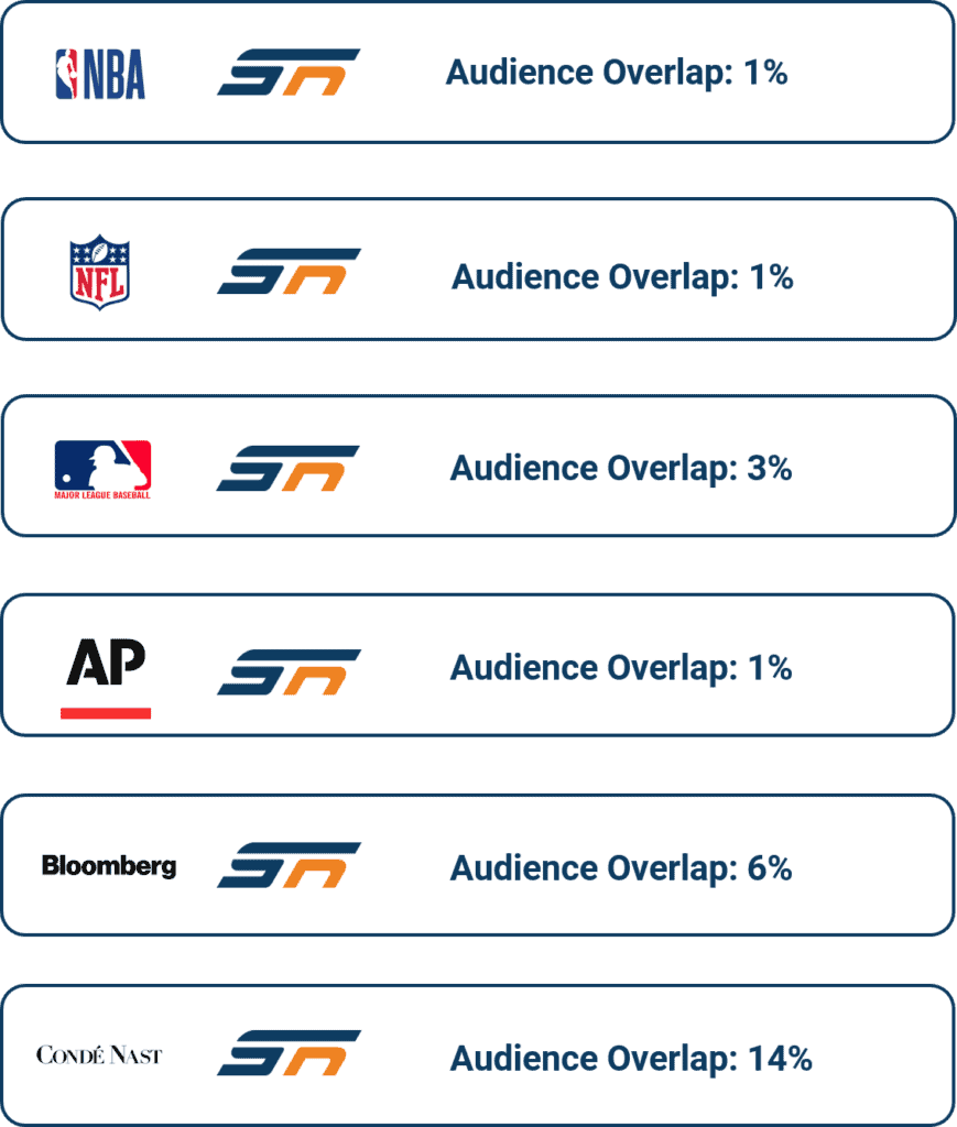 The SendtoNews Online Video Platform is trusted by content providers like MLB, NBA, NFL, Conde Nast, Bloomberg and the Associated Press to extend their brands to new and incremental audiences, as illustrated in the Comscore cross viewership comparison below.
